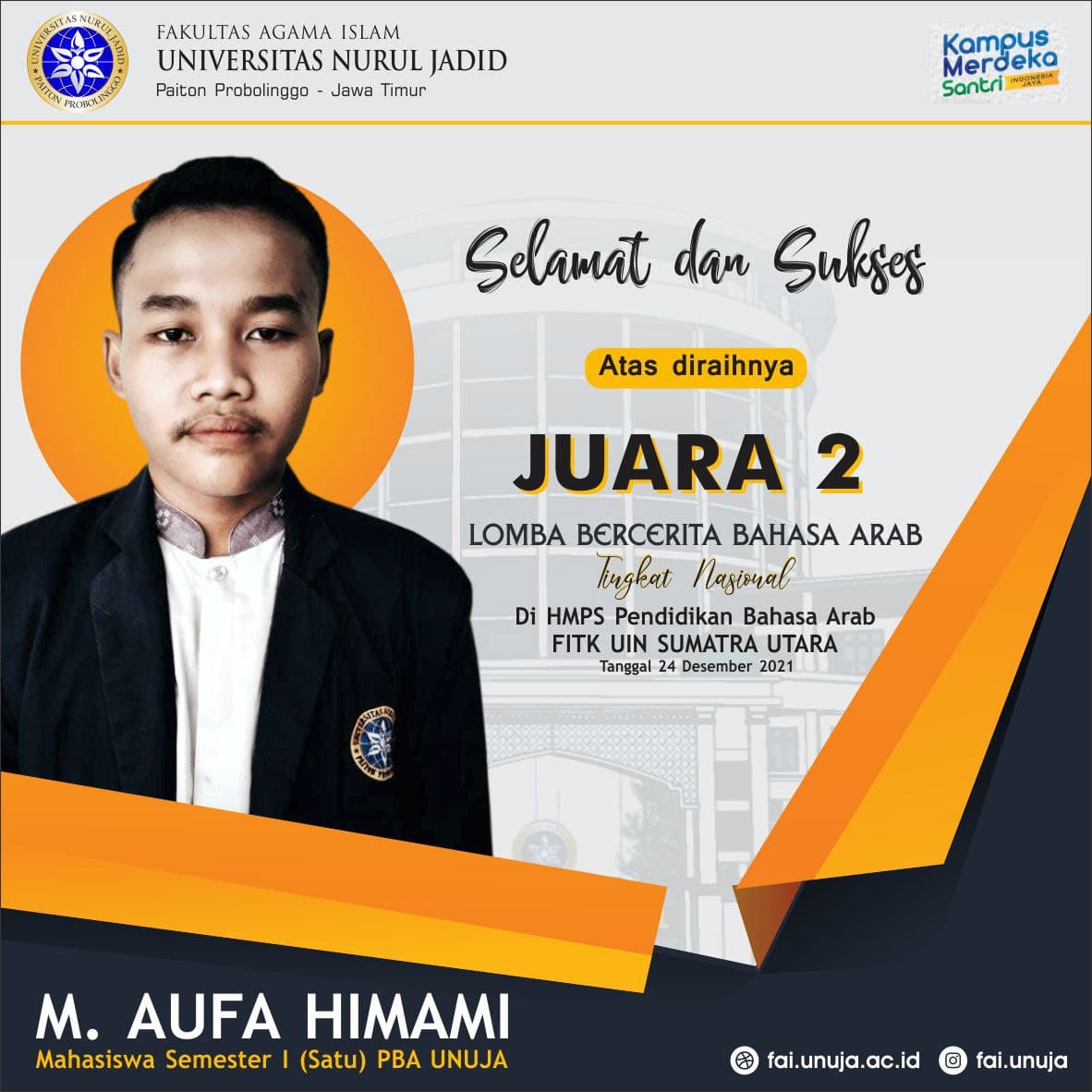 Adalah Aufa Himami mahasiswa semester 1 PBA UNUJA merupakan salah satu kader baru juara bahasa Arab yang siap bersaing secara kompetitif pada ajang-ajang perlombaan ketrampilan bahasa Arab di semua tingkatan yang siap bersaing secara sehat ke depannya.