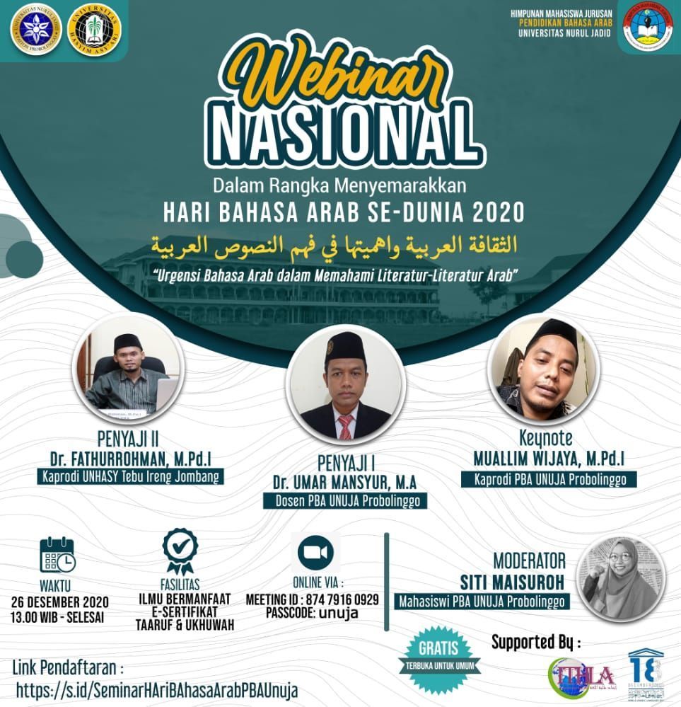 Sabtu 26 Desember 2020 merupakan hari suka cita bagi Program Studi Bahasa Arab (PBA) UNUJA Paiton, pada hari itu Himpunan Mahasiswa Jurusan (HMJ) Program Studi Bahasa Arab (PBA) UNUJA Paiton rayakan Hari Bahasa Arab Sedunia dengan mengadakan Webinar Nasional kerjasama dengan PBA UNHASY Jombang dengan kesepakatan tandang-kandang. Webinar dimulai tepat jam 13.00 ba'da duhur hingga selesai.Â