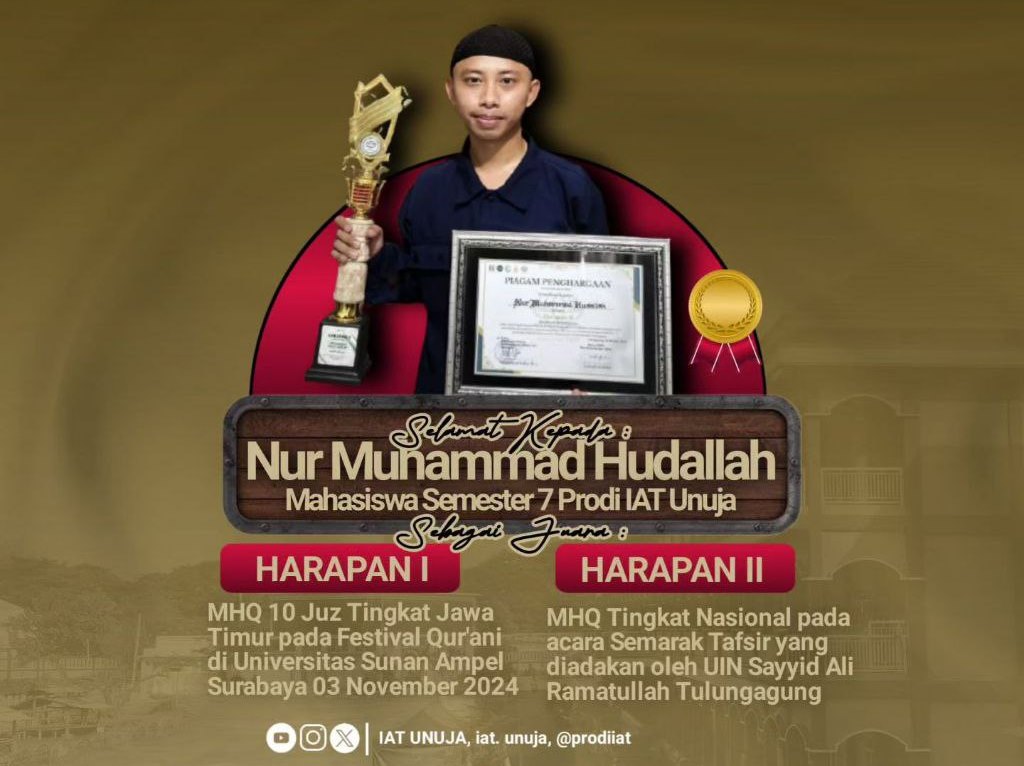 Prestasi membanggakan kembali ditorehkan oleh mahasiswa Program Studi Ilmu Alqur’an dan Tafsir (IAT) Fakultas Agama Islam (FAI) Universitas Nurul Jadid (UNUJA). Nur Muhammad Hudallah, mahasiswa IAT, berhasil meraih juara dalam dua lomba Musabaqah Hifzhil Qur'an (MHQ) bergengsi.