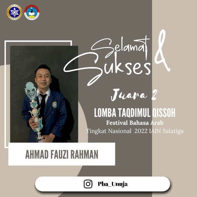 Ahmad Fauzi Rahman mahasiswa PBA UNUJA semester 7 yang namanya sudah cukup dikenal pada jagat perlombaan adu bakat & keterampilan bahasa Arab tingkat nasional telah meraih berbagai macam kejuaran lomba bahasa Arab seperti debat, pidato, & drama berbahasa Arab pada even-even sebelumnya.