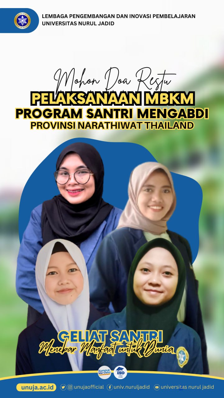 Tahun Akademik 2022-2023 Genap Dua (2) Mahasiswi Prodi Pendidikan Bahasa Arab (PBA); Asviatul Maufiroh (PBA 6) & Safina Indriani (PBA 6) ikut ambil bagian bersinergi dalam program Kuliah Kerja Nyata (KKN) skema Santri Mengabdi di SMP ISLAM WITTHAYATHAN SCHOOL, alamat: 131 m.6 PhraiWan Subdistrict, TakBai District Narathiwat Province 96110. Sedangkan program MBKM santri dalam negeri telah dilakukan di negeri pada tahun sebelumnya, misal di PP Nurul Jadi Bali & PP Nurul jadi Waktobi Sulawesi Tenggara & daerah-daerah Indonesia lainya. Program KKN MBKM santri mengabdi didukung Lembaga Penerbitan, Penelitian, dan Pengabdian kepada Masyarakat (LP3M) UNUJA & Lembaga pengembangan & Inovasi Pembelajaran (LPIP) UNUJA. Â