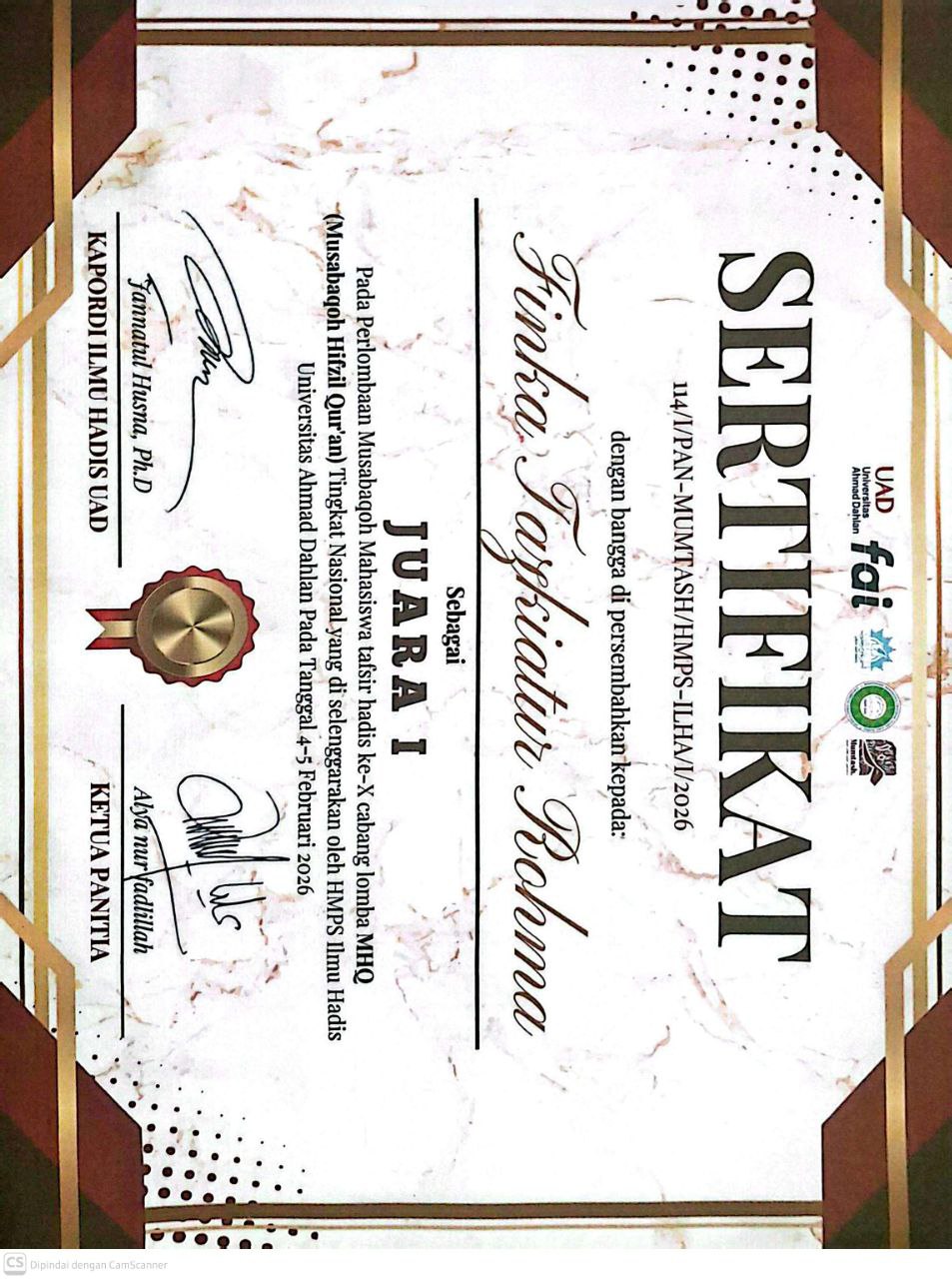 Juara I Lomba Bercerita Bahasa Arab Festival Sastra Arab (FESTRAB) Tingkat Nasional BSA IAIN Syekh Nurjati Cirebon 2021 |